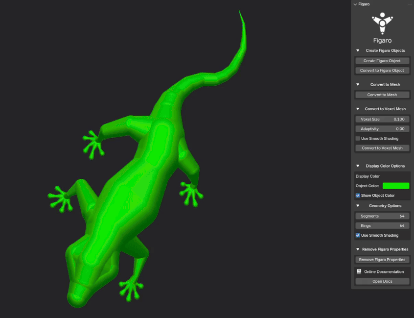 Figaro is a tool designed for creating base meshes for characters and creatures quickly and easily. This is achieved by allowing users to add volumes around vertices, edges, and faces, with the shape of the volumes being determined by interpolating each radius assigned to each vertex. It is based on tools like ZBrush's ZSpheres and Blender's Skin modifier while extending their core concepts to allow for more complex shapes.